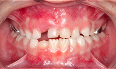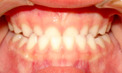As imagens abaixo ilustram um caso de mordida cruzada anterior tratado com ortopedia facial. Observe que os incisivos superiores, que se encontravam inicialmente atrás dos incisivos inferiores, passou a ocluir corretamente.